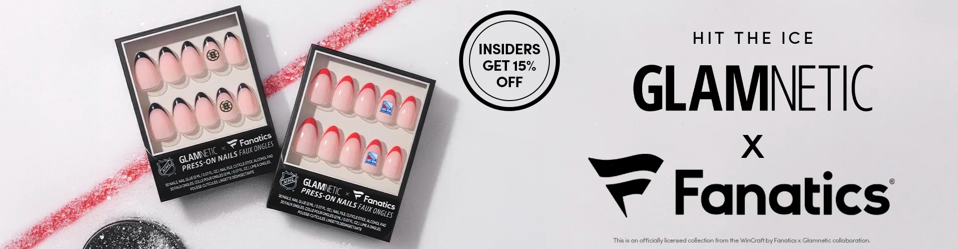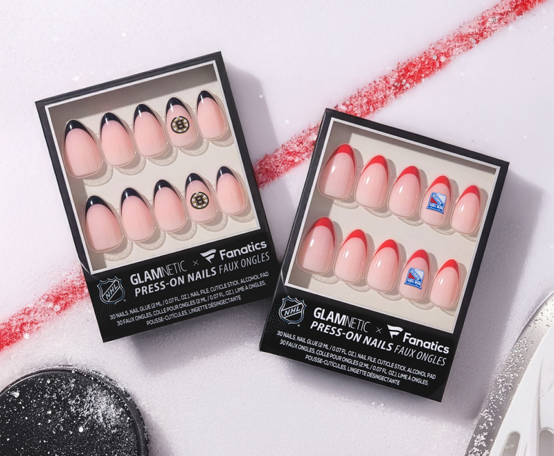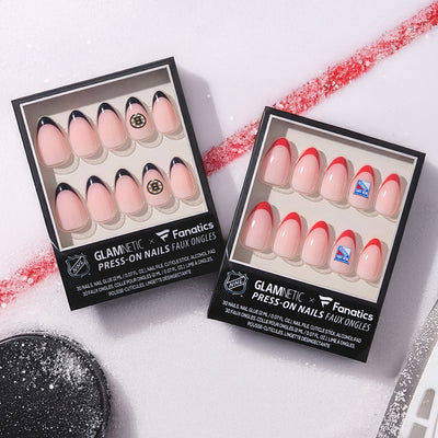 Now this is a power play. The Glamnetic x Fanatics collaboration hits the ice with a winning lineup of 5 NHL press-on nails for true die-hard fans. Each set features our short almond French tips in a fresh game-day uniform, complete with official team colors and logoed accent nails for next-level fan fingers. Built with salon-quality durability and high-gloss finishes, these goal-worthy tips are ready to score big from puck drop to overtime.