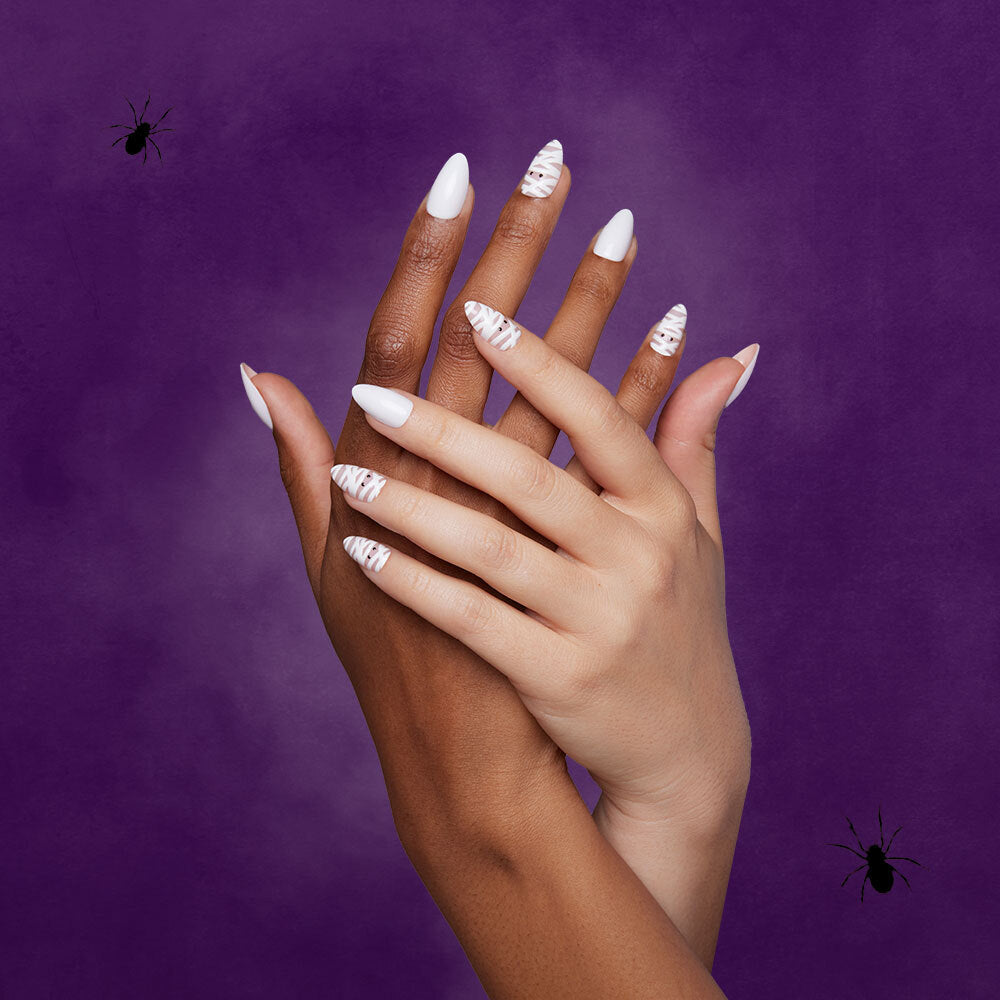 A hand with long, almond-shaped white nails—one nail features a mummy design. The hand holds white fabric, showcasing glamnetics playful Wrapped Up press-on nail set.A box of glamnetic Wrapped Up press-on nails in a short almond shape, featuring glossy pale pink nails with white tips and two accent nails with a white and pink abstract squiggle design.