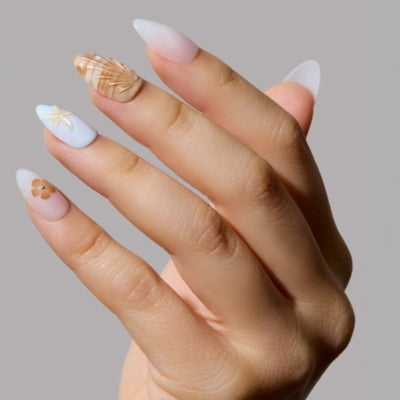 Lleva tus uñas a la costa con el set de uñas postizas Sea Star. Diseñado para quienes crecieron coleccionando conchas marinas, estas uñas cortas almendradas tienen bases opacas y semitransparentes, detalles de conchas en 3D y motivos florales. Con un acabado brillante y refrescante, este set te trae el trópico a la palma de la mano.