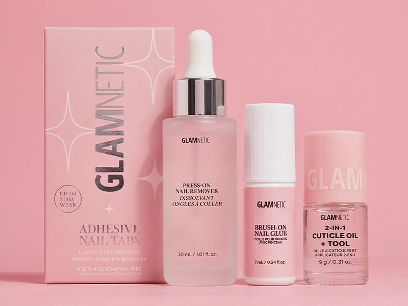Apply an even layer of glue to natural nails and back of Glamnetic nails. -