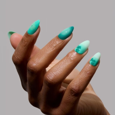 Prepare to make waves with the Siren Green Press-On Nail Set. Inspired by swirling seafoam, these short almond nails enchant with a cool aquamarine gradient and delicate floral accents. Finished with a dewy gloss, this set glistens like sea. Apply in 5 minutes for up to 2 weeks of mermaid-approved glam